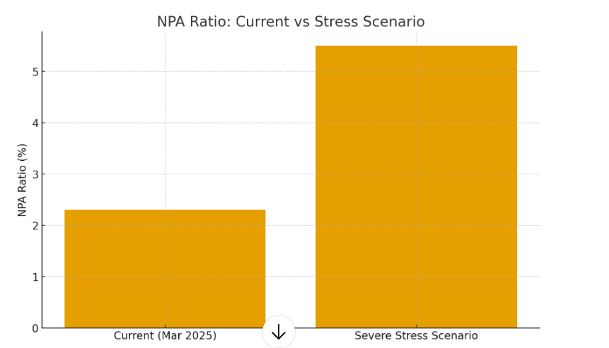 The health of India’s banking system has improved significantly. Gross NPAs have declined to nearly 2.3%, and even in a high-stress environment, any potential rise is expected to stay within controllable levels.