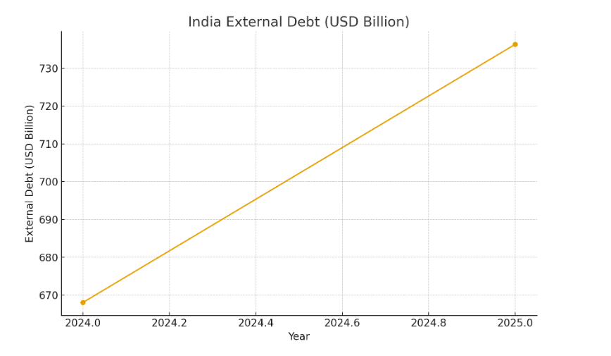 This Graph illustrates the increase in India’s external debt from 2024 to 2025, rising from roughly USD 668 billion to nearly USD 736 billion. It reflects a steady upward trend and signals a higher dependence on external borrowing over the year.Bottom of Form